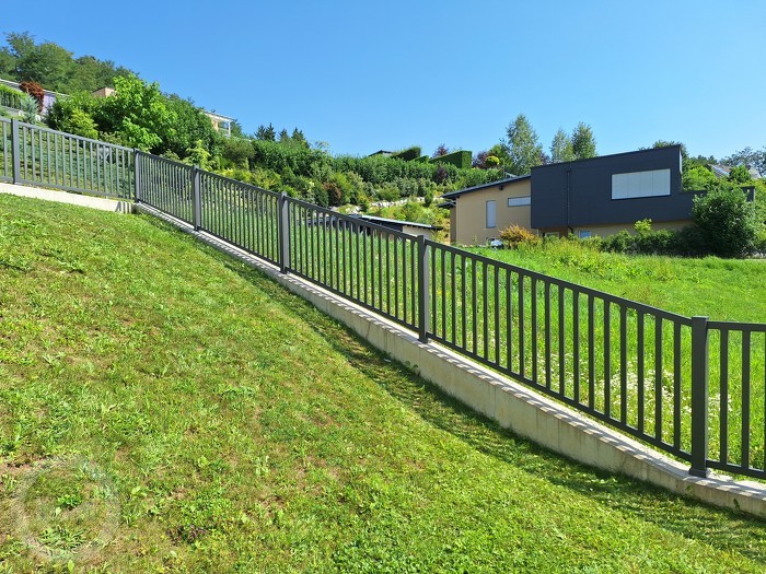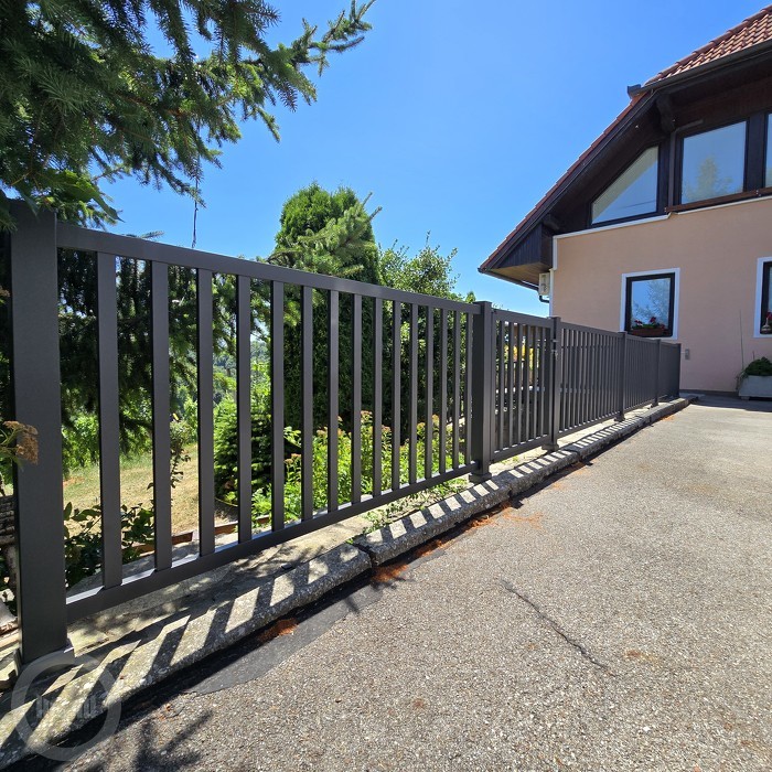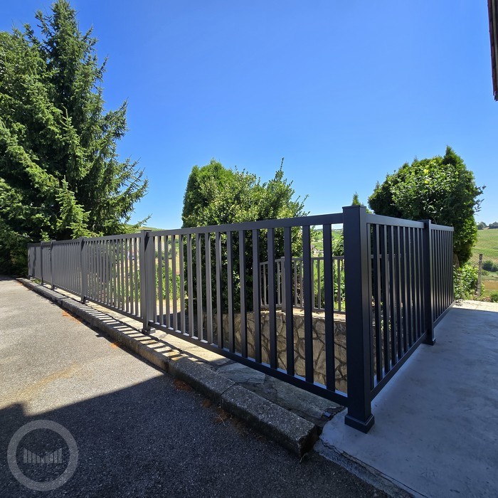 Der Vertikalzaun besteht im Ganzen aus Aluminium und ist aus scharfkantigen Stäben zusammengesetzt. Anhand seiner klaren und reinen Linien ist er ideal für moderne, minimalistische Gestaltung Ihres Wohnraums. Es handelt sich um einen beständigen Aluminiumzaun, der keine Wartungsarbeiten benötigt.