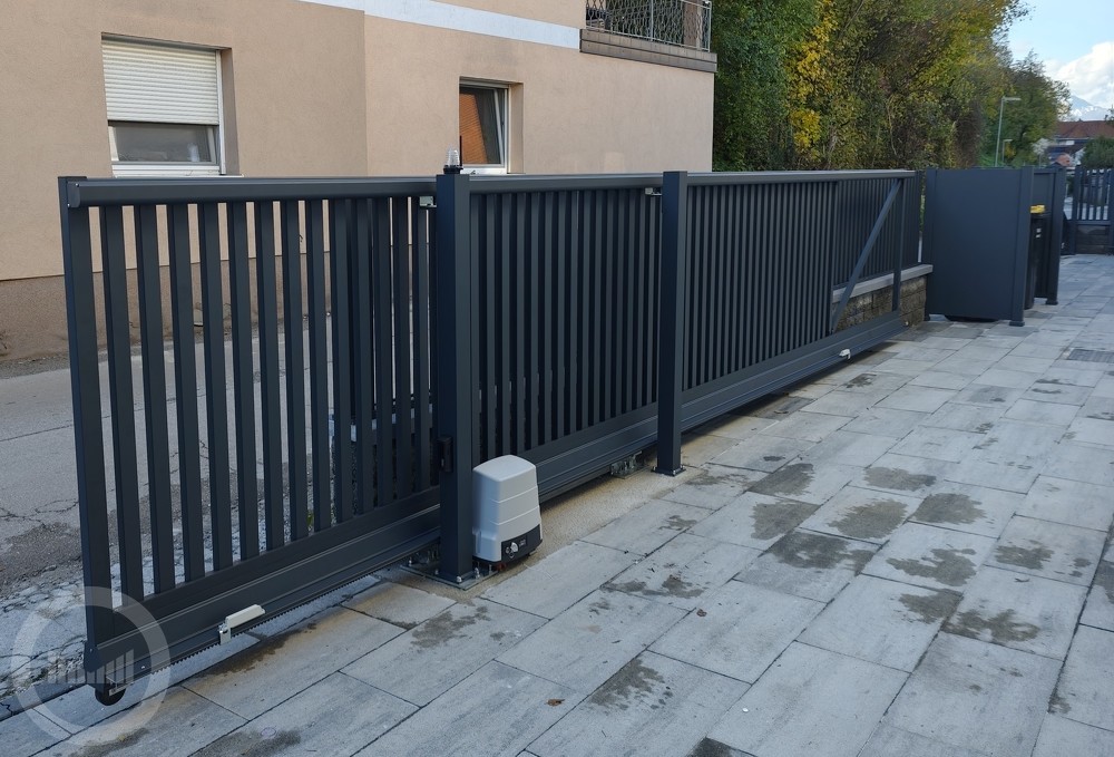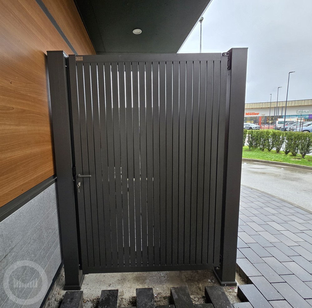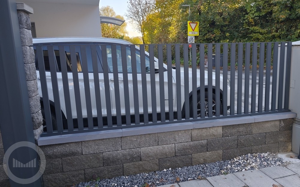 Der Zaun besteht aus vertikalen rechteckigen Alugitterstäben mit 3 cm Tiefe, 5 cm Stärke und einer Tragsäule mit 11 cm Breite.